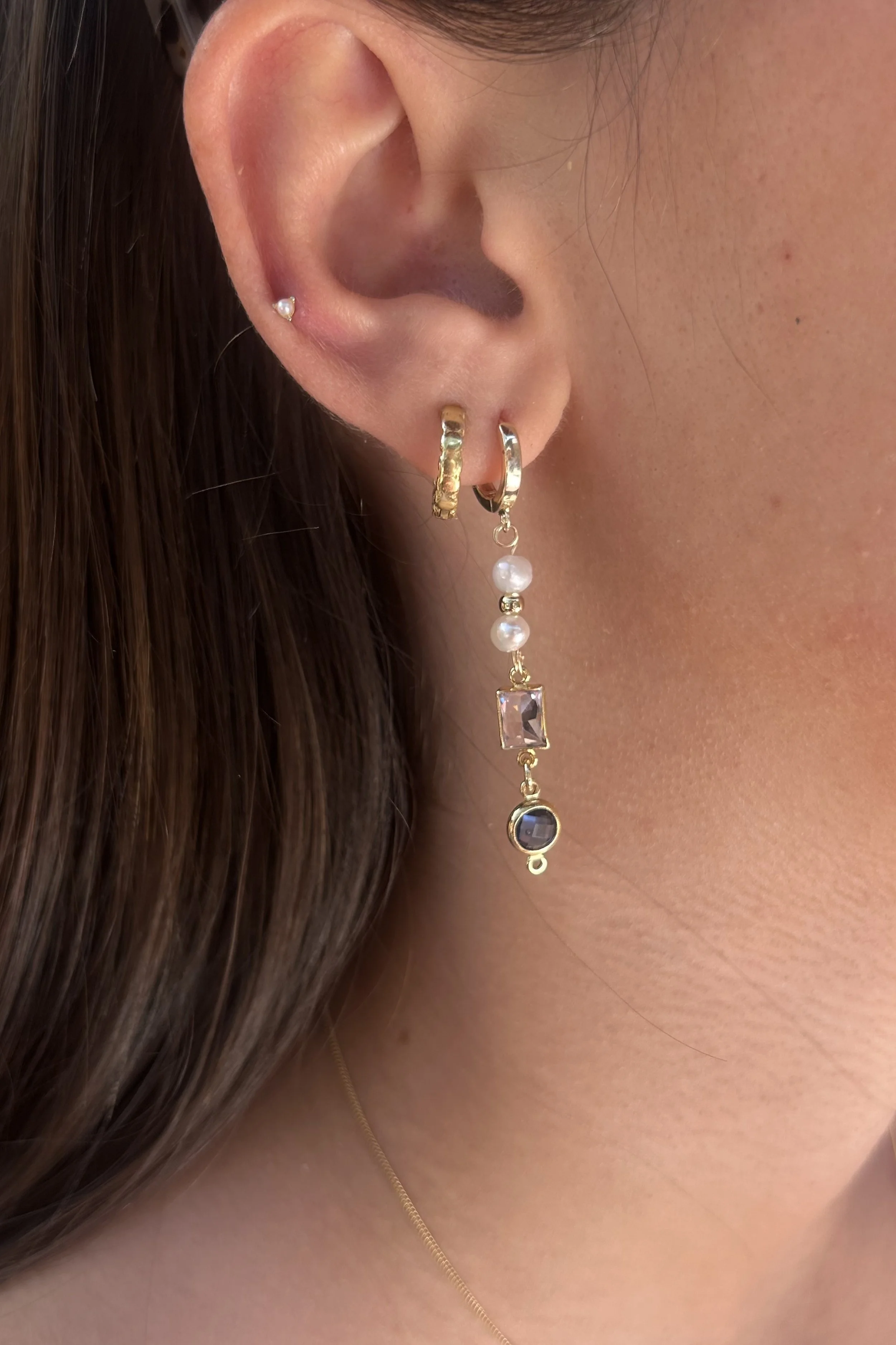 12mm 14k gold-plated huggies with pink stone. Tarnish-free when properly cared for.
